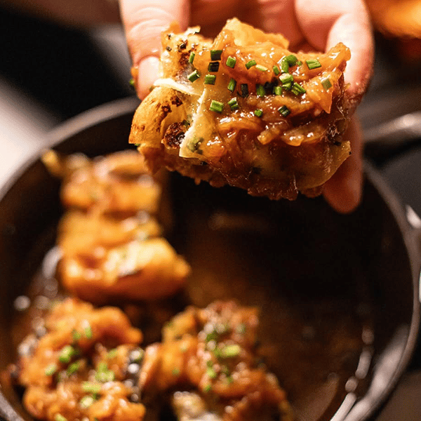 What: Warm Focaccia, Melted Gruyère and Rich French Onion Broth
